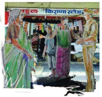 అక్కడ దుకాణం యజమాని, అతని కొడుకు, ఒక పోలీసు, సరుకులు కొనుక్కోవటానికి వచ్చినతను ఉన్నారు. ఒకరికొకరు గొడవ పడుతున్నారు. అవ్వ పిల్లల్ని అక్కడే ఉండమని.. తాను దుకాణం దగ్గరికి వెళ్ళింది.