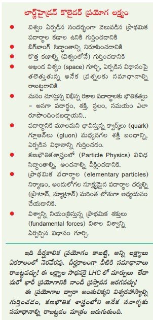 మనకు కనిపిస్తున్న విశ్వం బిగ్బాంగ్ విధానంలో ఏర్పడిందని సిద్దాంతీకరించుకున్నాం. కాని, దీనికి ఆధారమైన ప్రయోగాలు గాని, నిరూపణలు గాని శాస్త్రజ్ఞుల దగ్గరలేవు. దీని నిరూపణకై ప్రయోగాలు చేయాలనే తపన దశాబ్దాల కాలంగా సాగుతూనే వుంది. చివరికి 20వ శతాబ్దపు చివరి దశకంలో దీనికై రూపకల్పన జరిగింది. సుమారు వంద దేశాలకు చెందిన 500కు పైగా వివిధ భౌతికశాస్త్రపరమైన సంస్థలకు చెందిన 10 వేలకు పైగా శాస్త్రజ్ఞుల సమిష్టి కృషి ఫలితంగా లార్జ్ హాడ్రన్ కొలైడర్ (Large Hadron Collider-LHC) అనే భారీ ప్రాజెక్టుకు రూపకల్పన జరిగింది. ఇందులో భారతీయ శాస్త్రజ్ఞులు సుమారు వందమంది దాకా వున్నారు. విజ్ఞానశాస్త్ర పరంగా ఇప్పటి వరకు జరిగిన అన్ని ప్రాజెక్టులకన్నా అత్యంత ఖరీదైన, అతిపెద్ద భారీ ప్రాజెక్టు ఇదే! యూరప్ అణుపరిశోధనా సంస్థ (European Union for Nuclear Research ఫ్రెంచ్లో CERN) చేపట్టిన ఈ ప్రాజెక్టు సృష్టి మూలాలను, పదార్థం పుట్టుకను గుర్తించాలని లక్ష్యంగా పెట్టుకున్నది.