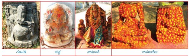 ఊరి బయటికి వెళ్లే తొవ్వలో ఎత్తైన రాతిగద్దె మీద పోచమ్మ దేవతతో పాటు పలుదేవతలు శిల్పాలున్నాయి. పోచమ్మదేవత చాముండి ప్రతిమా లక్షణాలతో వుంది. కాని, మడిచిన కుడికాలి కింద గొర్రెపోతు, ఎడమకాలి కింద అసురుని తలలున్నాయి. సాధారణంగా చాముండి దేవత ప్రతిమకు కాళ్ళకింద మూడు తలలుంటే కామాక్షి శిల్పమని అంటారు. ఇక్కడున్న శిల్పం ప్రత్యేకం. మరెక్కడా ఇంతకు మునుపు చూడని దేవతాశిల్పమిది. ఈ దేవతకు ఎదురుగా తలలేని రెండుచేతుల చాముండి శిల్పం, నాలుగుచేతులతో మరొక చాముండి శిల్పలున్నాయి. అక్కడున్న చింతచెట్టు వందలయేండ్ల నాటిదట. ఆ చెట్టు మొదట్లో పెట్టివున్న శిథిల మహిషాసురమర్దిని శిల్పం రాష్ట్రకూటశైలిలో చెక్కివుంది.