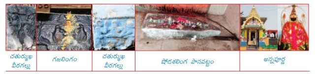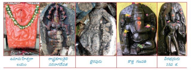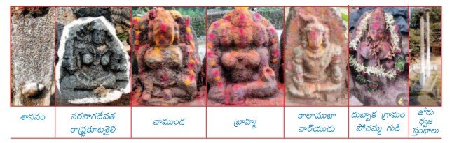 పోచమ్మ గుడి: పోచమ్మగుడివద్ద 9 చాముండ శిల్పాలు, 1 బ్రాహ్మీ శిల్పం, 1 కాలాముఖాచార్యుని శిల్పం, 1 నాగశిల ఉన్నాయి. వీటిలో రాష్ట్రకూటుల కాలానివి, కళ్యాణీచాళుక్యుల కాలానివి విగ్రహాలున్నాయి.